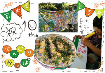 春とゆうより、初夏の日差しが感じられた4月26日千田町の冒険遊び場「てんぐりかっぱ」へgoヽ(*´∀`)ノ4月で10周年を迎えたてんぐりかっぱ。釜戸で炊いたご飯を酢飯にして、たけのこ入のお寿司。それと持ち寄り汁で、お腹いっぱい。美味しかった〜ヽ(●´ε`●)ノ 長女ユパが2歳のときからスタッフとしてお手伝いに行ってる冒険遊び場。何回通ったのかは、わからないけど、楽しいことばかりで、あっとゆうまに過ぎていったような気がする。(この頃は、なかなか行けなくて残念)わたしらも広瀬に移住して10年目になる。過...