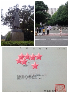 今日は早稲田大学の合格発表日でした。なんと!合格してましたあ〜!!親としてはやっぱり経済的に国公立への思い入れの方が強いので、そんなに緊張感もなく過ごしてたのだけど、合格の知らせを聞いた時は、やはり飛び上がるくらい嬉しかったです。認めてもらえるというのは、本当にありがたいことです。姫は本心はこっちの方が行きたい大学のはずです。帰国子女がひしめく中で自分の力が試せるんだもんね。よく頑張った!姫!あと一つ、国立もクリアして、自分の進む道を決めようね。本当にお疲れ様!大隈重信様、ありがとうございます!