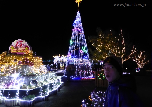 〔フラワーパークにて〕 普段は昼間にした行かないフラワーパークに夜な夜なイルミネーションを見に行きました。気温0度ととても寒かったけど沢山のイルミネーションがどれもとても綺麗でした。エントランスの所で記念写真です。ぱちりっ。