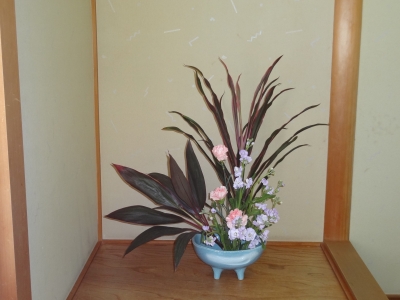 なんとも、むずかしいお花が来ました。 もしかしたら・・・ むずかしいというのは、大人の気持ちで、 子ども達は、いつも通りに 感じていたのかもしれませんが・・・ ドラセナが2種類。 葉の色は同じでも、細いのと普通の。 丈も高いのと短いの。 いつものパターンと違うと感じて、 とまどったのは講師だけ? とにかく、2種類のドラセナを挿して、 カーネーションとストックをいけました。 大きく広がるドラセナの足元に、 お花がきちんと挿せましたね。 全体のまとまりを、 少し後ろに下がって...