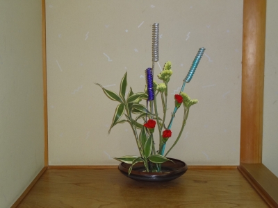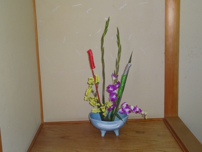 わかばいけばな教室には、 何年も続けて 通ってきてくれている子達がいます。 月に2回でも、 5年、6年とおけいこしていると、 お花の腕も上がってきます。 そういう子達には、なるべく自由に発想していけてもらいます。 クリスマスらしく、 キラキラしたつるの加工品が付いてきました。 それから、グラジオラスとデンファレ、スターチス。 グラジオラスが大きかったので、 のびのびいけました。 うまく重心をとりながら、お花をまとめましたね。 デンファレを大きく流しました。 個性が生きました...