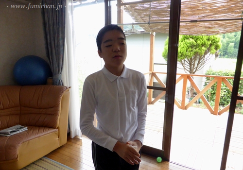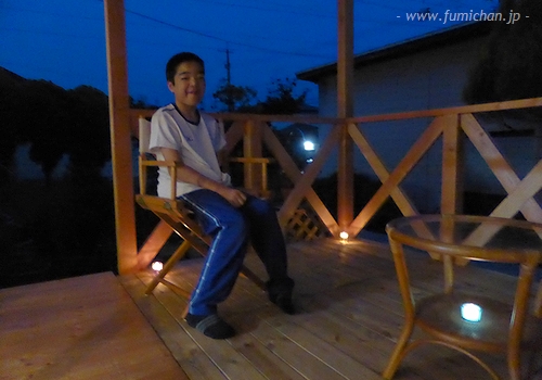 〔自宅にて〕 最近、僕がとても気に入っている場所がこれです。お父さん自作のウッドデッキです。左右のドア部分と屋根は未完成ですが風呂上りの夕涼みには最高です。所々に置いてあるキャンドルの揺れる灯もとてもロマンチックで素敵です。