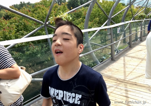 〔フラワーパークにて〕 夏休みが終わってからやっと夏らしい日々が続く中、隣のT県にあるフラワーパークに行きました。大温室から回廊への通路の床が木製で歩く度にトントンと心地よい音がするのがとても楽しかったです。