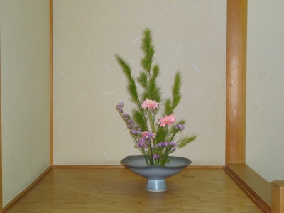 おけいこのお花です。 コアラファンとガーベラとスターチス。 ガーベラとスターチスは、おけいこの定番です。 お花代から考えれば、そうなります。 でも、コアラファンは初めて! やわらかく細かい葉がふさになっています。 やさしいお花ができそうですね。 そう、ガーベラのやさしいピンクと合わせれば、 気持ちの安らぐお花がいけあがりました。 わかば教室の子ども達。 おけいこ中はとっても静か。 熱心にお花に取り組んでいますからね。 学校やおうちでは、 大きな声で話したり、 元気に走り...