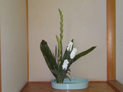 わかばいけばな教室でお花を始めてから、 まだ新しい子たちの作品です。 今は、ハサミの使い方に慣れてきたところですね。 剣山にしっかりさすことも、できるようになりました。 グラジオラスをまっすぐに立てて、 白いストックの花を高さを変えてさしました。 そこへバランの大きな葉をそえていきます。 大きいので、どこにさそうか、迷ってしまいますね。 3枚のバランのうち、1枚はまあるくまとめています。 足元がすっきりしましたね。 バランの葉先に表情をつけました。 やわらかい曲線をなが...