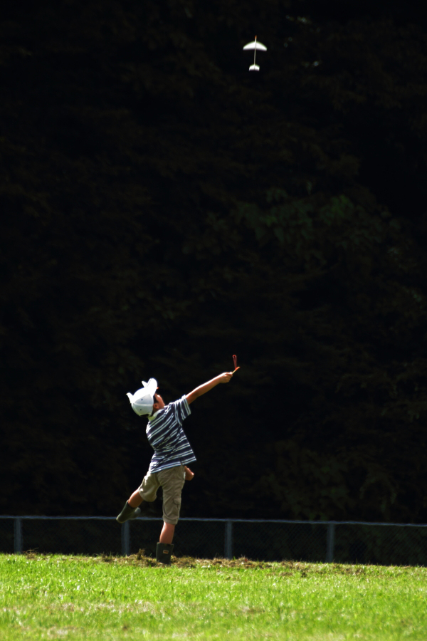 ここ数日の雨天で、中止になると予測していた紙飛行機大会。叶う事なら参加したいと願っている坊には申し訳ないけれど、僕としては、今週のスケジュールの状態により、坊を連れて行く事が危ぶまれていたので、正直の処、雨が降ってくれて、予備日に延期して欲しいと願っていた。 此度の坊は、垂直上昇機で参戦するとの決意で、この1か月余りで2機の機体をじっくり製作していた模様。昨夕のうちに雨がやみ、僕の予定がクリアになって、何とか行けそうだと決まった時には、本当に喜んでいた。 会場に到着すると、いつもの先輩方...