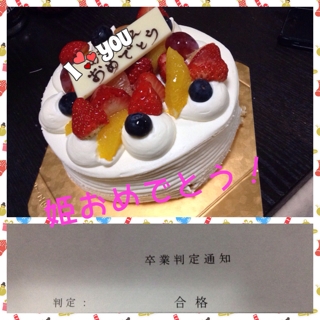 JUGEMテーマ:子供達との記憶今日はいよいよ姫の合格が判定出る日。普通は何事もなく卒業出来る筈なのに、やはりそこは姫1号です。必修科目を1教科落としたせいで認定試験を受ける羽目に。その出来栄えが散々やったとのことで親子でドキドキしながら待ってました。郵便バイクの音。やった〜!合格!おとんにも内緒やったから本当によかった。買った袴も着れるよお!芸大編入も大丈夫!ホッとして、ケーキを買って二人で大人食べしました。う〜ん、美味しかった!