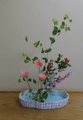 教室で使っている花器は、会場の備品を借りています。 水盤はいくつかありますが、 子ども達は好きな花器のところに座りますね。 それで、先に来た子が帰ってから、 また同じ花器に雰囲気の違う花ができました。 大きめの水盤なので、のびのびと。 また、ゆったりと。 子ども達は、明るいきれいな水色がお気に入り。 どちらかというと、茶色い花器は人気がない。 そういうことが最近わかってきました。 花器と花の調和も、 こういう繰り返しの中で学んでいってほしいです。 JUGEMテーマ:子供達と...