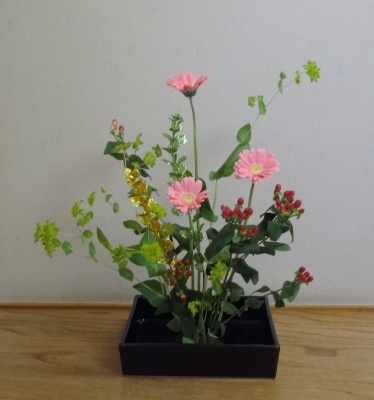 またまた、同じ花器の作品。 黒は花色が映えます。 真四角の使いやすい水盤です。 おけいこを始めてまだ1年に満たないけれど、 しっかりがんばっていますよ。 見本を参考にしながら、自分らしさもアピールしましょう。 明るく元気なお花がいけあがりました。 こちらは・・・ ずっとおけいこを続けてきたから、 自分でお花を構成できるようになりましたね。 ガーベラをメインに、 ほかの花材はひかえめに。 お花は、いろんな表現ができる世界です。 おけいこでいけた形と、 家でいけなおすとき...