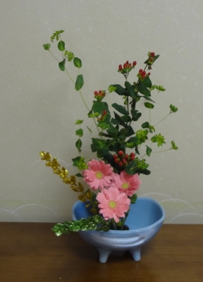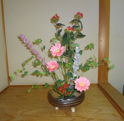 ニュースでは、大雪の地方を映していました。 大阪で、寒い寒いといっても雪はないです。 この程度の寒さに、負けていられないですよね。 クリスマスシーズンには、 夜間のイルミネーションが定着してきました。 (でも、個人のお宅では一時期より控えめ。 節電意識の表れかな?) おけいこでも、クリスマスっぽいお花を。 キラキラしたラメリーフが入っています。 自由に発想していけることをテーマにしました。 かわいらしく、また、のびのびと。 みんなの個性が出ましたね。 赤いヒぺリカムの実は、...
