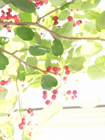輝きの季節、5月 4月に白い花を咲かせたわが家のジューンベリー。 今年も赤い実をいっぱいつけました・・・! 朝は東から強く陽があたるんです。 木が嬉しそう。 壁に葉っぱの影がうつり、その揺れを見る幸せよ。 今年は実が実る前に枝の整理もとくにしなかったので 葉がもっさり。 それで隠れられる安心感があるのか、小鳥が前よりたくさん来て毎日美味しく食べてくれています この一番いい季節もあと少し。 まだまだ輝け