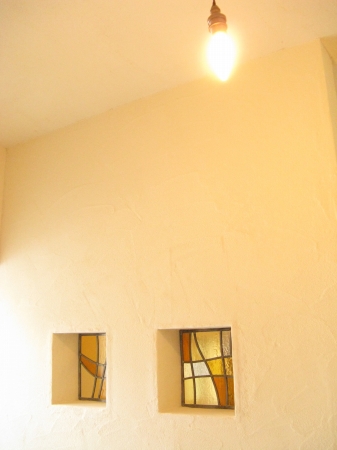 最寄駅は逗子。 この駅に着くと、深呼吸したくなる。 海も小高い丘もすぐそこにある葉山。 風光明媚なこの地にお家を建てられたM様。 ご注文頂いたステンドグラスパネルを到着後すぐ取付けて頂いたとのことで、先週伺いました…! 玄関入ってすぐの壁です。 壁厚の中央ではなく敢えて端に取付けられました。 246 × 246mm × 2 頑張って自主施工された珪藻土の壁。 ラフな感じの塗りがとても味わいがあり 素敵な仕上がりです! 奥はオープンスペースになっていて、ギャラリーでもできそうな良い雰囲気・・...