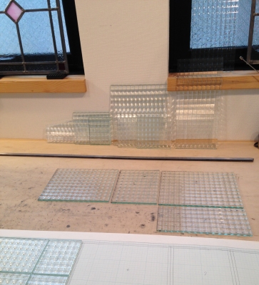 店舗の建具に入れるステンドグラスを制作中です。 サンゴバン社のこのガラスは制作工程のなかではカットに気を使う。 波の方向があるので表、裏とひっくり返してカッターを入れる。 たいがいのガラスより1mm厚いのでなかなか手強く割取る時は大サイズのガラスの時と同様に 作業台のフチを利用してバンッと勢いよく割る。 粉のように小さいガラス片が顔に突き刺さっても平気だが 眼だけは守るようにしている。 カット終了後、組むのは速いです。 テクスチャーの面白さを消さないために、線数もとっても少ない直線デザイ...