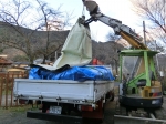 JUGEMテーマ:ログハウス 小雪がちらつく寒い朝 雨に濡れていたシートは風にあおられてすっかり乾いています シートのおかげ 雨水に濡れた天井板はほんの数枚で済みました 世間は仕事納め 天気が良くなり管理人はかき入れ時(笑) ユニックに妻壁板を積み込みました かなりの枚数なのでハシゴでの運搬はきつい そこでフレコンバックを使うことにしました これならユニックで吊り上げることができますから 積み込みに午前中イッパイかか...