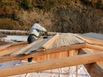 JUGEMテーマ:ログハウス 予報では雨の心配が無さそうです 朝 シートの撤去で天井に上がりました 何とシートが凍ってパリパリ 霜の影響でしょうね 手はかじかんで足元はツルツル 迂闊にシートの上を歩くことができないくらい 9枚のシート 一番でかいのは10×10メートル 垂木の上に団子状態にしました 大玉転がしです 本日はK君の応援がありました 身軽なK君 こんなことへっちゃらなのです 不思議ですねぇ 一人だと怖く...