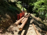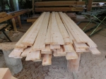 JUGEMテーマ:ログハウス 雨が上がり製材の続き 垂木太鼓挽き製材です 一昨日までで後5本を残すのみとなっていました 朝からかかりきりでやっと完了 ほとんどの丸太が元径20?前後 長さは6.1メートル 一人では到底持てません フォークリフトで運んで台車に固定して製材しますが 製材の終わった後は人力です 少し向きを変えて作業場に寝かせている土台端に引っ掛けます その後は土台の上を滑らして移動です これだけ製材完了 製材所に持って行けばほんの数時間分でしょうね 丸...
