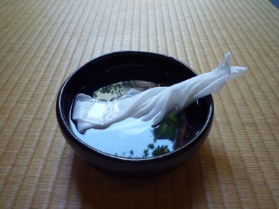 JUGEMテーマ:お茶を楽しむ生活 今日は洗い茶巾の点前。 茶室に涼をよぶための演出として、 前回の平水指は、大きな水面で、 視覚に訴えましたが、 今回は水の滴る音という、聴覚に訴える工夫です。 水を張った平茶碗に二つ折りのままの茶巾を入れて運び出します。 棚物を用いても、運び点前でもよいのですが薄茶に限ります。 水を張った茶碗ですから、両手で慎重に扱い、 運び点前でも棗、茶碗を同時に運び出すことはしませんので、 棚の方が手数が省けて、スマートです。 置き合わせた...
