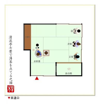 JUGEMテーマ:お茶を楽しむ生活七畳シリーズの4回目。※丸畳六畳の客座と丸畳一畳の点前座で構成された茶室のことをいいます。清流亭七畳(せいりゅうていななじょう)清流亭は、南禅寺山門の北に位置し、かつての塔頭楞厳院があった地に建つ山荘です。数奇屋工匠北村捨次郎が創意をこらした、大正初期の建築です。亭内に茶室「七畳の間」があります。■好み:北村捨次郎■広さ:七畳 付書院■八炉区分:四畳半切本勝手■床の間位置:下座床■類似間取りの茶室:なし「清流亭七畳で薄茶を点てる。」の図。※建水を進め、居ずまいを正した場...
