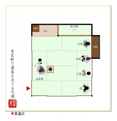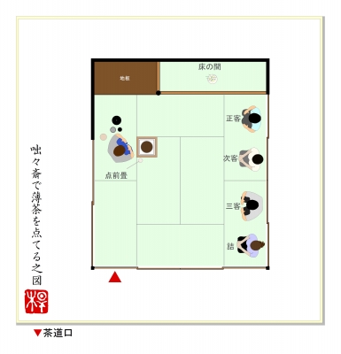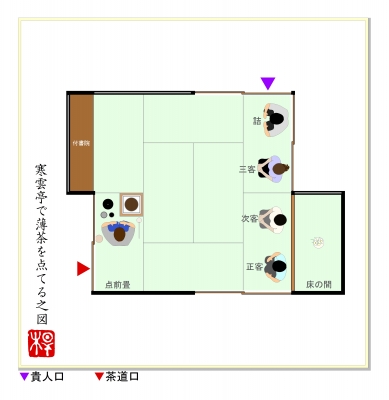 JUGEMテーマ:お茶を楽しむ生活 八畳シリーズの3回目。※丸畳七畳の客座と丸畳一畳の点前座で構成された茶室のことをいいます。 寒雲亭(かんうんてい)京都市裏千家にある茶室。千宗旦の好みと伝えられます。裏千家では最も古い書院ですが、創建の事情は不明です。■好み:三世千宗旦 伝■広さ:八畳■八炉区分:向切本勝手■床の間位置:客座下座床■類似間取りの茶室:なし「寒雲亭で薄茶を点てる。」の図。※建水を進め、居ずまいを正した場面。■間取り概略。八畳敷き、露地に面して貴人口をあけ、前に小縁を付けます。一間床と...