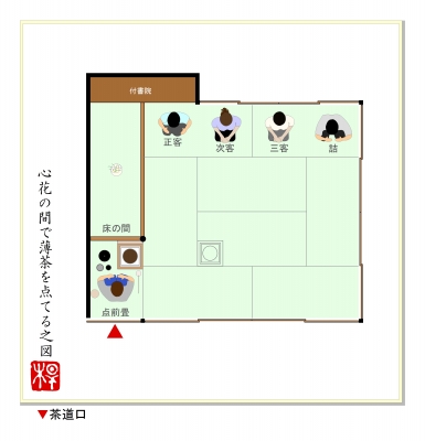 JUGEMテーマ:お茶を楽しむ生活八畳台目シリーズの3回目。※丸畳八畳と台目畳一畳で構成された茶室のことをいいます。 心花の間(しんかのま)裏千家・茶道会館内にある茶室です。十四世淡々斎が、家元の西向かいに建設し、 昭和31年5月、開館式が行われました。■好み:十四世淡々斎■広さ:八畳台目 付書院■八炉区分:向切本勝手(四畳半切本勝手)■床の間位置:風炉先床(上座床)■類似間取りの茶室:起風軒「心花の間で薄茶を点てる。」の図。※建水を進め、居ずまいを正した場面。■間取り概略。八畳敷四畳半切本勝手・七尺...
