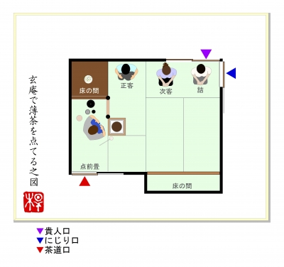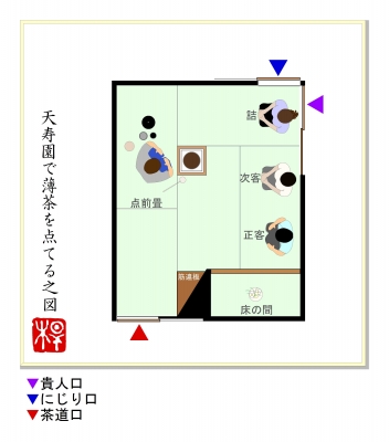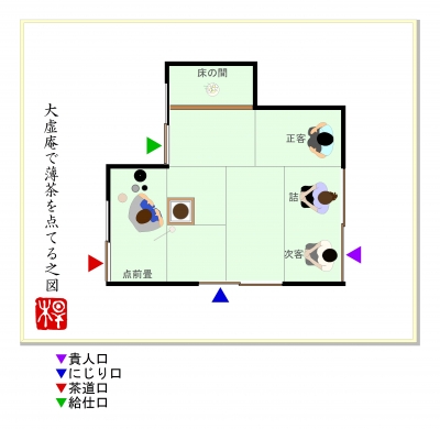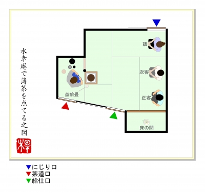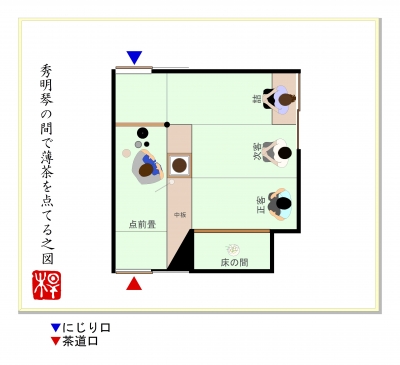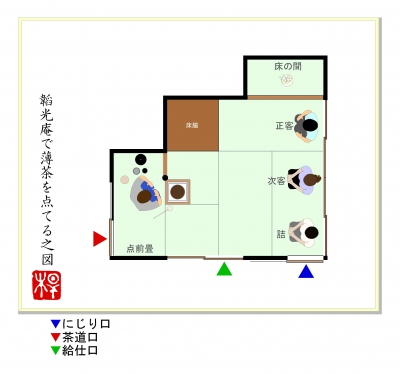 JUGEMテーマ:お茶を楽しむ生活四畳半台目シリーズの4回目。※丸畳四畳と半畳一畳の客座と、台目畳一畳の点前座で構成された茶席のことをいいます。 水幸庵(すいこうあん)岐阜県下呂温泉水明館。歴史ある和風旅館の庭園に建つ茶室です。■好み:不詳■広さ:四畳台目 中柱■八炉区分:台目切本勝手■床の間位置:下座床■類似間取りの茶室:なし「水幸庵で薄茶を点てる。」の図。※建水を進め、居ずまいを正した場面。■間取り概略、特徴。基本構成は、多くの類似茶室を数える「密庵」形式。下座床、四畳半台目で、中柱を立て、台目切りに...