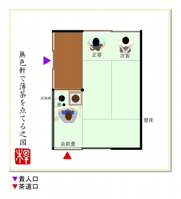 JUGEMテーマ:お茶を楽しむ生活五畳シリーズの2回目。※丸畳四畳の客座と丸畳一畳の点前座で構成された茶室のことをいいます。 無色軒(むしきけん)京都市上京区小川町、裏千家今日庵に残されている茶室遺構の一つ。七代の竺叟宗乾が好んだと伝えられ、天明大火後に再建されました。■好み:竺叟宗乾■広さ:五畳 榑縁(くれえん)・風炉先柱■八炉区分:向切本勝手■床の間位置:客座下座壁床■類似間取りの茶室:なし「無色軒で薄茶を点てる。」の図。※建水を進め、居ずまいを正した場面。■間取り概略、特徴。全体は六畳の広さ。左側の...