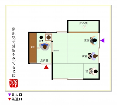 JUGEMテーマ:お茶を楽しむ生活五畳半シリーズの3回目。※丸畳四畳と半畳一畳の客座と丸畳一畳の点前座で構成された茶席のことをいいます。 常光院(じょうこういん)祇園の南側エリアにある建仁寺。建仁寺境内の北に境外塔頭・常光院(じょうこういん)があり、明治初期の梧庵(?林紹材、1820−1897)好み、道安囲いの茶室が造立されています。■好み:梧庵■広さ:五畳半 道安囲・書院■八炉区分:向切本勝手■床の間位置:上座床■類似間取りの茶室:なし「常光院で薄茶を点てる。」の図。※建水を進め、居ずまいを正した場面。■...
