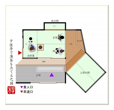 JUGEMテーマ:お茶を楽しむ生活 五畳シリーズの5回目。※丸畳四畳の客座と丸畳一畳の点前座で構成された茶室のことをいいます。 夕佳亭(せっかてい)京都鹿苑寺金閣の東北方の高台に建つ茶屋。明治初年に焼け、同7年に再建されています。■好み:金森宗和 伝■広さ:五畳 榑縁・竹縁・上段の間■八炉区分:四畳半切本勝手■床の間位置:上座床■類似間取りの茶室:なし「夕佳亭で薄茶を点てる。」の図。※建水を進め、居ずまいを正した場面。■間取り概略、特徴。おそろしくエキセントリックですが、丸畳が5枚ですので、五畳茶室と...