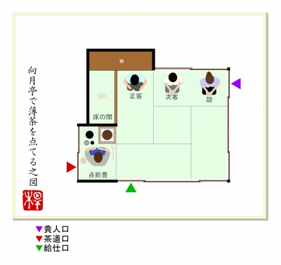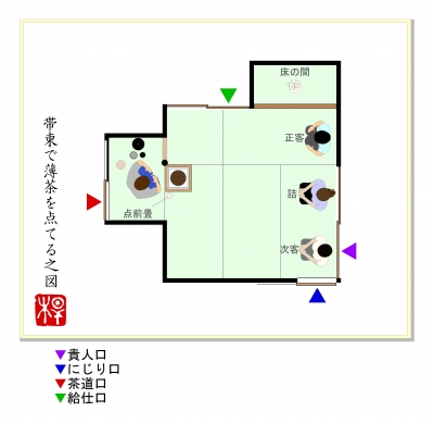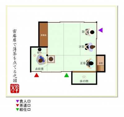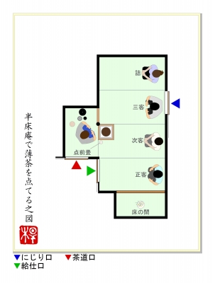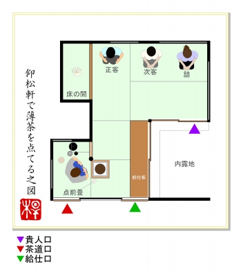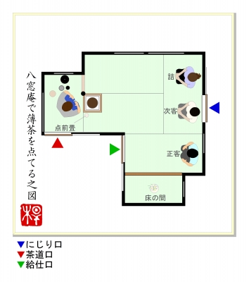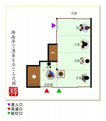 JUGEMテーマ:お茶を楽しむ生活 四畳台目シリーズの1回目。※丸畳四畳の客座と台目畳一畳の点前座とで構成された茶席のことをいいます。 湘南亭(しょうなんてい)苔寺(こけでら)の通称で知られる西芳寺(さいほうじ)池庭の南端に「建つ庭間建築。慶長年間(1596−1615)に千少庵によって再興されたと伝えられます。■好み:千少庵伝■広さ:四畳台目 中柱・書院■八炉区分:台目切本勝手■床の間位置:亭主床■類似間取りの茶室:友賢庵「湘南亭で薄茶を点てる。」の図。※建水を進め、居ずまいを正した場面。■間取り概略、特徴...