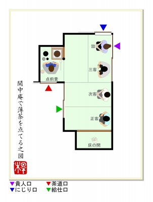 JUGEMテーマ:お茶を楽しむ生活四畳台目シリーズの4回目。※丸畳四畳の客座と台目畳一畳の点前座とで構成された茶席のことをいいます。 閑中庵(かんちゅうあん)東京都港区南青山にある根津美術館の庭園内に建つ茶室の一つ。元は、庭園内の別の茶亭「斑鳩庵」に付属していましたが、平成3年、現在の場所に移築され、四畳半囲炉裏構えの牛部屋とともに使われています。■好み:不詳■広さ:四畳台目 中柱■八炉区分:向切本勝手■床の間位置:下座床■類似間取りの茶室:なし「閑中庵で薄茶を点てる。」の図。※建水を進め、居ずまいを正し...