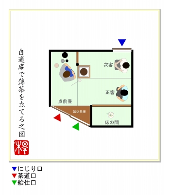 JUGEMテーマ:お茶を楽しむ生活 三畳シリーズの10回目。※丸畳三畳の構成。一如庵(いちにょあん)※詳細不詳。■好み:不詳。■広さ:三畳 客座板■八炉区分:向切本勝手■床の間位置:風炉先床■類似間取りの茶室:なし「一如庵」で薄茶を点てる。」の図。※建水を進め、居ずまいを正した場面。■間取り概略、特徴。客座は丸畳二畳、点前座は一畳ですが、半畳分ずれて、二畳台目向切のような位置関係になっています。空いたスペースに風炉先床を配置しています。客畳の前方の客座板が特徴的ですが、床の間の間口確保の工夫なのかもしれま...