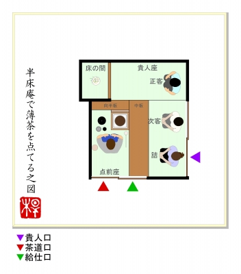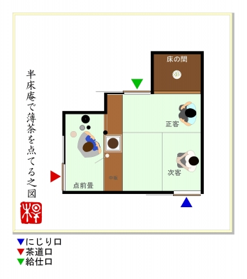 JUGEMテーマ:お茶を楽しむ生活二畳台目二畳シリーズの2回目。※丸畳二畳と、台目畳二畳の構成。半床庵(はんしょうあん)久田家は、千利休の時代に活躍した久田宗栄を初代とし、現在十三代続く茶家。久田家の庵号は半床庵(はんしょうあん)といい、三代宗全(1647〜1707)による茶室半床庵は、表千家 不審菴を母体として考案されたものです。■好み:三代久田宗全■広さ:二畳台目二畳 中板・中柱■八炉区分:台目切本勝手■床の間位置:上座床■類似間取りの茶室:なし「半床庵」で薄茶を点てる。」の図。※建水を進め、居ずまいを正した場...