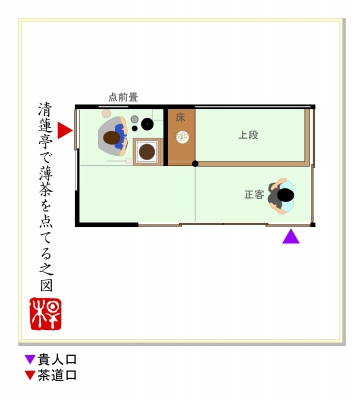 JUGEMテーマ:お茶を楽しむ生活 二畳台目シリーズの14回目。清蓮亭(せいれんてい)京都市等持院の庭中にある茶亭です。足利義政の好みと伝えられますが、明らかではありません。■好み:足利義政 伝■広さ:二畳台目 上段■八炉区分:向切本勝手■床の間位置:風炉先外向床■類似間取りの茶室:なし「清蓮亭」で薄茶を点てる。」の図。※建水を進め、居ずまいを正した場面。■間取り概略、特徴。全体のアウトラインは長四畳ですが、客畳として丸畳二畳を横に並べ、掛物をかける壁の前の一畳を上段とし、上段から見えないところに、台目...