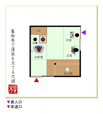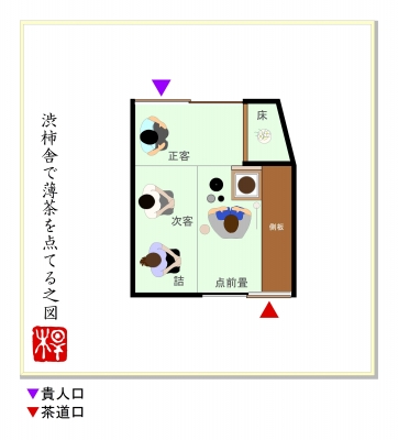 JUGEMテーマ:お茶を楽しむ生活二畳台目シリーズの15回目。渋柿舎(しぶがきしゃ)茶室の所在地、由来は不詳。■好み:不詳■広さ:二畳台目 側板■八炉区分:隅炉逆勝手■床の間位置:風炉先床■類似間取りの茶室:なし「渋柿舎」で薄茶を点てる。」の図。※建水を進め、居ずまいを正した場面。■間取り概略、特徴。客畳として丸畳と台目畳が矩の手に敷かれます。点前座は丸畳と側板を合せた広いスペース。大変ユニークですが、逆勝手の隅炉に合わせ、出来るだけ余裕を確保する配慮と思われます。床は、風炉先床で、掛物をかける奥の壁が...