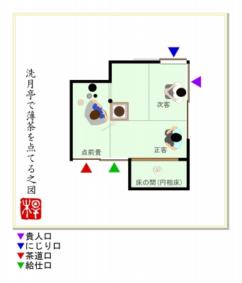 JUGEMテーマ:お茶を楽しむ生活 二畳台目二畳シリーズの1回目。※丸畳二畳と、台目畳二畳の構成。洗月亭(せんげつてい)銀閣寺の洗月亭(せんげつてい)は、武者小路千家十一世一指斎一叟宗守好みと伝えられます。この茶室の床の間はたいへん独特で、円相床(えんそうどこ)と呼ばれ、床框を入れ、床の前面に円弧を描いた形の壁をつけています。茶席にダイナミックな動きが生じています。■好み:武者小路千家十一世一指斎一叟宗守■広さ:二畳台目二畳 中柱■八炉区分:台目切本勝手■床の間位置:下座床(円相床)■類似間取りの茶室:...