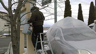JUGEMテーマ:外壁|屋根の防水塗装 まだまだ雪が残る長野県松本から、今日も外壁塗装の情報をBlogで配信! 本日は、引き続き松本市にある安曇野菓子工房 里菓抄まる山 氷室店さんの塗装の様子を、お伝え致します。 ちょっとお天気は寒空だったのですが、、、養生作業が進んでいました! 先日立てた足場にも、養生材が巻かれています。 これで江古野がカメラに夢中になって足場にぶつかっても、痛くないですね 。(*^▽^*;)ゞ 窓や看板、雨どい、電源コードなど、塗装が付かないよ...