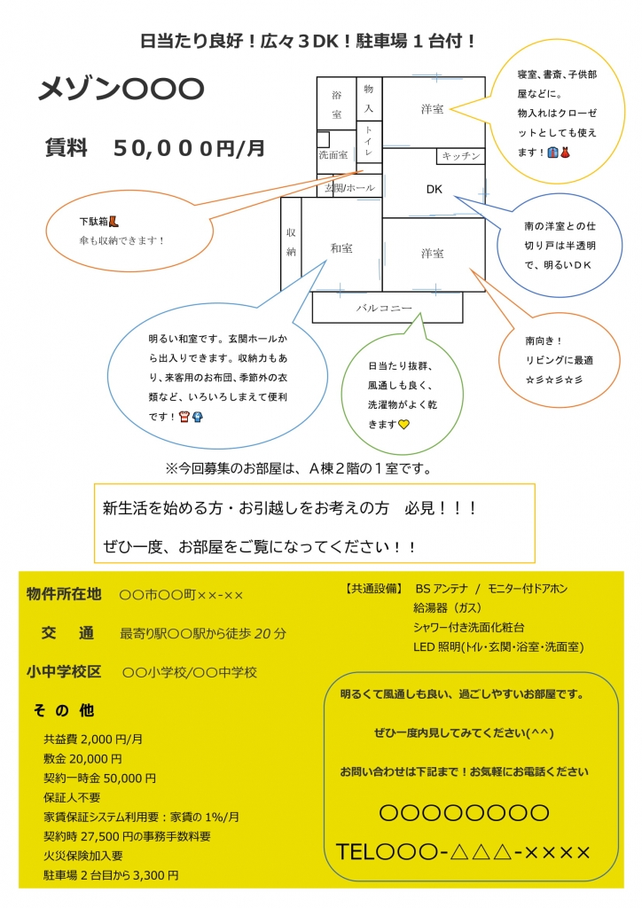 JUGEMテーマ:賃貸 大手の管理会社の一括借り上げの家賃保証の契約を解除し、ある物件の管理をすることにしました。 いったい何から始める??? ・・・というところからのスタートです(><) 鉄骨造り2階建て、部屋数は8、現在7つのお部屋にご入居いただいています。 入居者の皆様へのご挨拶は終わったので、次にすべきことは・・・ 今空いているお部屋の募集かな? それでは早速、募集のチラシを作ってみましょう。 新聞の折り込みチラシなどを...