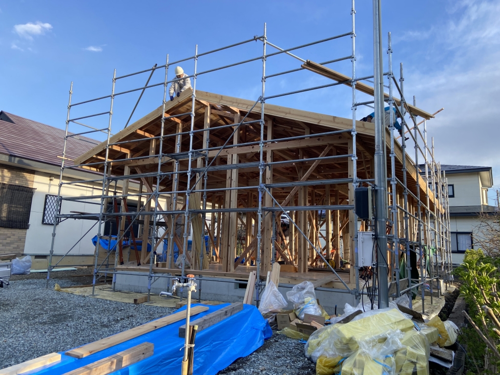 JUGEMテーマ:注文住宅 東根のE様邸のご紹介です。 先日建方も無事執り行われ、いよいよ木工事に入ります。 今、弊社での注文が多い平屋のお住まいです。 ここで、平屋の特徴等をご紹介させて頂きます(^^)/ 平屋はワンフロアで生活が完結するように考えられています。そのため、段差がない状態を実現しやすいのです。一生のことを考えると、もともと段差が少なくバリアフリー化に対応しやすいというのは、平屋のメリットと...
