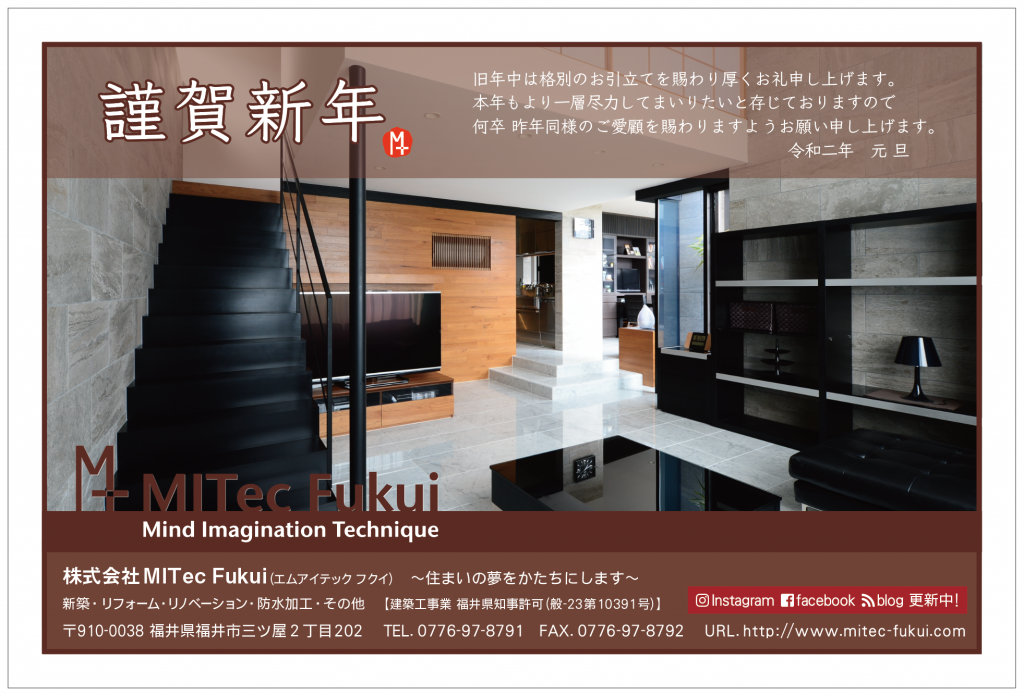 旧年中は格別のお引立てを賜わり厚くお礼申し上げます。 本年もより一層尽力して参りたいと存じておりますので 何卒 昨年同様のご愛顧を賜りますようお願い申し上げます。 令和二年 元旦 株式会社MITecFukui スタッフ一同