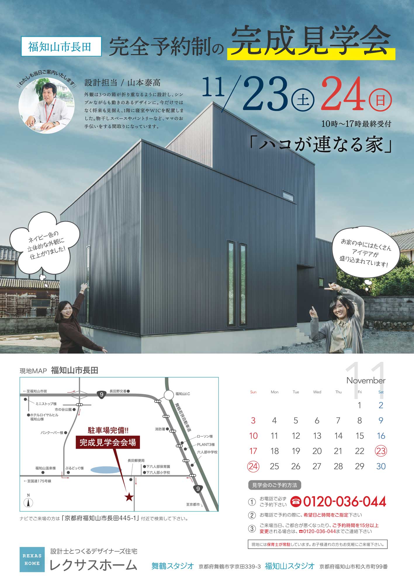 11月23日(土)24日(日) 予約制見学会 開催! 予約制見学会のご案内です! 外観は3つの箱が折り重なるように設計し、シンプルながらも動きのあるデザインに。 今だけではなく将来も見据え、1階に寝室やWICを配置しました。 物干しスペースやパントリーなど、ママのお手伝いをする間取りになっています。 【日程】 11月23日(土)...
