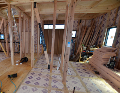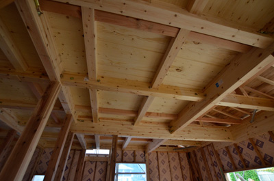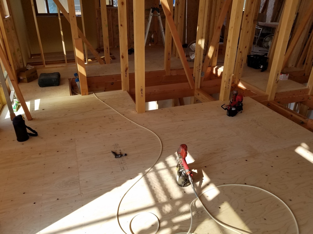 JUGEMテーマ:新築 JUGEMテーマ:注文住宅 先週は2階の床板をはり、中間検査も行いました。 中間検査は問題なく無事に終わりました。 中間検査とは・・・ 建物が完成してしまうと外から見えなくなってしまい確認できなくなる箇所がある為、工事の途中で施工不備がないかを確認する検査ことをいいます。建築物の安全性の向上の為に必要な検査です。