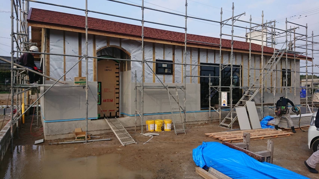 JUGEMテーマ:注文住宅 N様邸外壁工事 遮熱シートの上に寒冷地仕様伸縮率1/1000のサイディングを施工 外壁全部を、ベースコート(変性ポリマー)にスタンダードメッシュ(コーティングされたグラスファイバー)を塗りこみます。 アクリルベースのプライマーの施工 仕上げのSTO(ドイツ製)撥水仕上げ材で、汚れも落とします。 もうすぐ外壁が完成します、かわいい外観、屋根の色と、外壁の白色がベストマッチです。