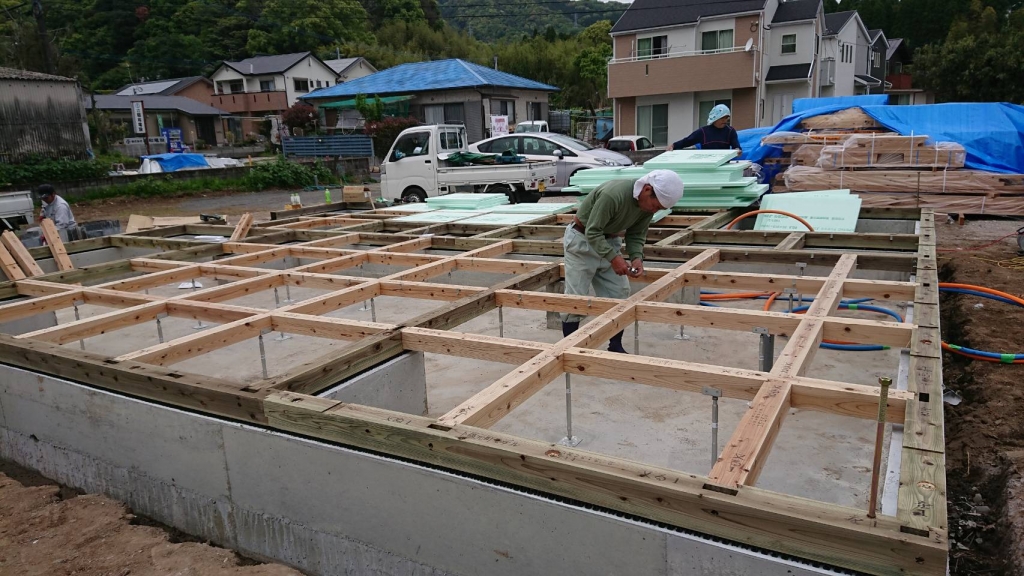 JUGEMテーマ:注文住宅 F様邸の基礎が完成して、大工さんが土台敷と床断熱材施工 土台は、強さを出すために正方形に造ります。(普通は長方形) 床断熱材を敷き込みます。 断熱材の施工が終わったら、構造用下地の施工です。 地震や外からの力に対応してくれます。これで棟上げの準備ができました。