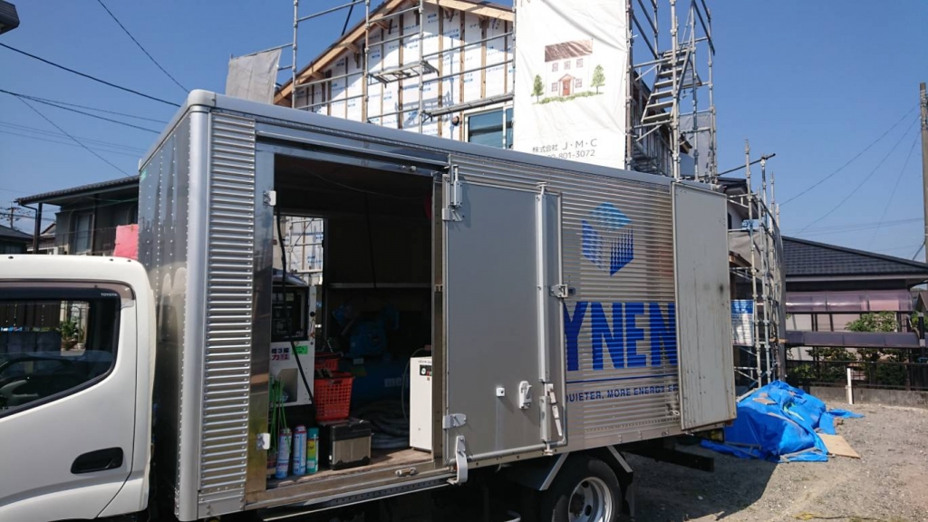JUGEMテーマ:注文住宅 本日、M様邸の断熱工事をしました。 発泡ウレタンを吹き付けしました、奥様のも見て頂き、もこもこと膨れていくさまが面白いです。 断熱専用車 作業中です。 約10?くらいの厚さになります。