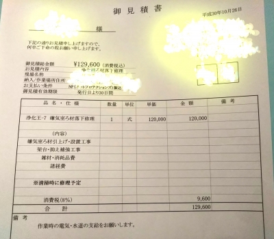 JUGEMテーマ:注文住宅 我が家の浄化槽に不具合が出ているとのことで、 先日業者さんが修理の見積もりに来てくださいました。 そして今日、見積書が届いたのですが…… 結構かかるんですね(T_T) 最近の一年、私が調子悪くてまともに働けなくなったり、 上の娘が高校に進学したり、 夫の車が突然の不具合で修理ができず、買え替えになったり、 私の車も足回りの不具合で10万ほどかかったり、 来年の...
