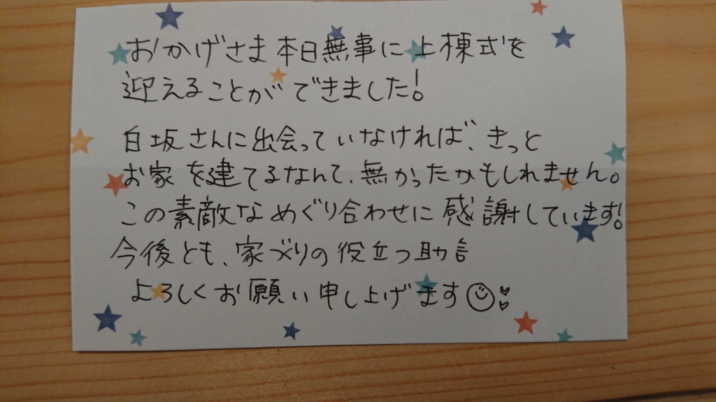 JUGEMテーマ:注文住宅 I様の上棟式があり、とってもうれしいお手紙を頂きました。 感謝でいっぱいです。 完成に向けて、喜んで頂けるように施工していきます。 I様これからも引き続きよろしくお願いします。