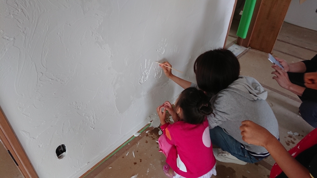 JUGEMテーマ:注文住宅 本日は、E様のLDK壁に漆喰を塗ってもらいました。子供たちにも参加してもらい上手に塗れました。 最後に家族の手形をつけてもらいました。とっても楽しかったです。 E様のいい思い出になると思います。これからもよろしくお願いします。