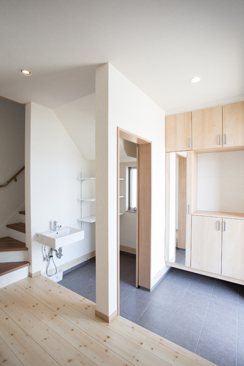 こんにちは。毎日良いお天気ですね。 さて、本日ご紹介するお宅はこちら。玄関に広い収納スペースと手洗い場を備えたお宅です。 小さなお子様はもちろんですが大人でも、汚れた手を洗うために洗面所まで行くまでに壁やドアノブや床を汚してしまうこと、ありますよね。そんなお悩みを解決してくれるのが玄関の手洗い場です。 収納スペースには、ベビーカーや自転車、冬場は除雪用のスコップ・濡れた防寒着なども楽々置けます。 また、玄関スペースと収納スペー...