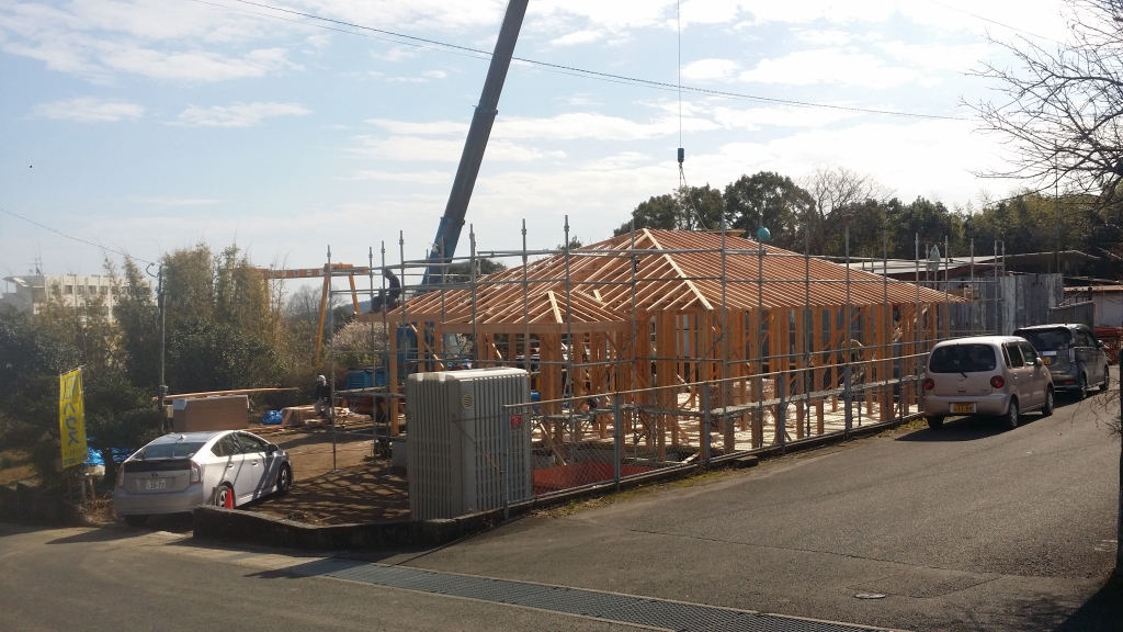 JUGEMテーマ:注文住宅 今日は、K様邸の棟上げ作業です。天気も良く絶好の棟上げ日になりました。 屋根が出来れば一安心です。木材がきれいですね。 明日からまた寒くなるみたいです。大工さん無理をしないように。 K様無事棟が上がってよかったですね、これからもよろしくお願いします。 今日は、雨が降っても大丈夫なように屋根のルーフィングまで施工します。