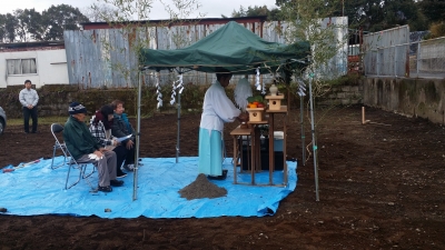 JUGEMテーマ:注文住宅 今日も寒かった。昨日は鹿児島市内も雪が舞っていました。 今年最初の地鎮祭です、K様、寒い中おじいさんにも参加頂きありがとうございました。 地鎮祭の準備中です。 無事に地鎮祭をすますことが出来、これからの工事の安全と無事完成できますようにお祈りをみんなで行いました。 写真には写っていませんが、協力業者さんにも参加頂きました。